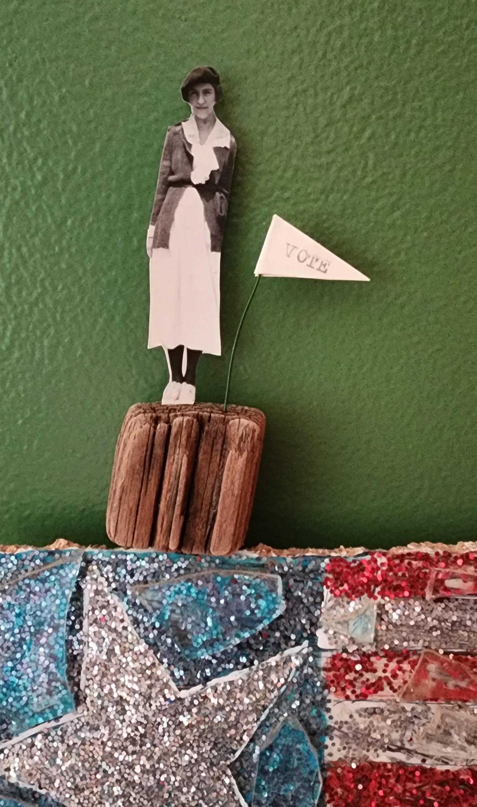 Yesterday, my dear friend Leighann gifted me with one of the darling acts of resistance she creates from found items, old photos, and messages stamped out on her antique typewriters. Violet, as I’ve named this vote-whipper-woman perched atop a flag by the outsider artist who was known as The Baltimore Glassman, will serve as a muse along the road to recapturing our country.